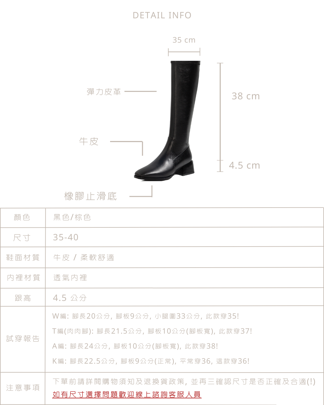 W編: 腳長21公分, 腳板9公分(正常), 小腿圍33公分, 平常穿35(還有點大), 靴子喜歡穿大一號較舒適, 這款穿36, 靴筒貼小腿, 沒有空間!